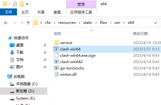 进入CFW的安装目录中的resources/static/files/win/x64(如为32位系统的程序则为x86),将默认的clash-win64.exe更名备份,我这里就改为clash-win642.exe